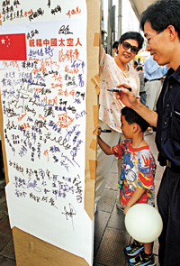 一位與父母剛逛完街預(yù)備回家的9歲男童施俊匡,在祝?埳虾灻С旨白8:教靻T。而爸爸施先生亦認(rèn)同,中國載人宇宙飛船升空是中國人的驕傲,因此希望簽名送上一點(diǎn)祝福。