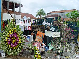 據介紹,巴厘島當局原打算在這塊空地上建一座紀念碑,但因有爭議,被擱置了下來。在街道左邊的小三角形地段,建筑工人正在鋪設路面。對面一座新商店已開始營業(yè),臨近的“泛印尼銀行”還修筑了一道新圍墻,樓頂加蓋了藍瓦新頂。除了這塊尚不知作何用途的空地以外,爆炸案現場已漸漸和庫塔街融為一體。