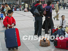 國慶黃金周臨近結(jié)束,經(jīng)由北京火車站返程的游客人數(shù)明顯增加,攜帶眾多行囊的游客在站前廣場上等候進站上車。中新社記者:滿會喬