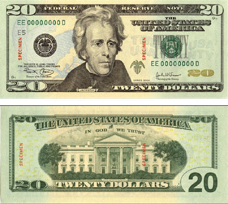 新版美鈔保持了傳統(tǒng)美鈔的外貌,尺寸亦沒有改變,鈔票的正反面也仍然是安德魯·杰克遜的圖像和白宮的圖案,只是色彩有所增強。新版二十美元是美國近代史上首次用多種顏色而非單一綠色印刷的鈔票,除了傳統(tǒng)的綠色以外,鈔票底色是桃色,上有藍色的鷹形圖案和銅色數(shù)字。
