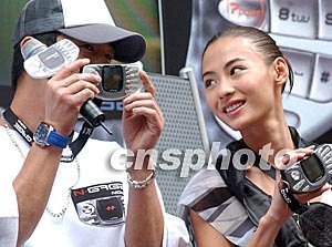 香港明星陳小春、張柏芝,周日一同亮相時(shí)代廣場(chǎng),為諾基亞首部手提游戲手機(jī)作推廣活動(dòng),張柏芝站在陳小春身后不停笑他十分投入的姿態(tài)。中新社記者:錢興強(qiáng)