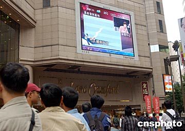 神舟五號飛船十月十五日順利升空,吸引香港市民云集時(shí)代廣場觀看電視新聞。中新社記者:潘索菲