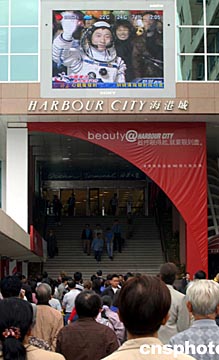 香港市民10月15日聚集在尖沙咀海港城大屏幕前,觀看中國太空第一人楊利偉登上神舟五號飛船升空消息。作者:洪少葵