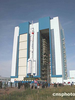 “神舟”五號(hào)緩緩離開(kāi)總裝測(cè)試廠房 向發(fā)射塔架進(jìn)發(fā)