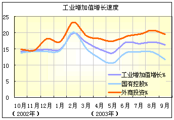 中國9月份工業(yè)生產(chǎn)主要情況及特點包括:國有、股份制、“三資”企業(yè)生產(chǎn)增速有所回落,集體企業(yè)生產(chǎn)增長加快。9月份,國有及國有控股企業(yè)完成增加值1672億元,比上年同月增長11.6%,減慢2.4個百分點;股份制企業(yè)增加值1506億元,增長16.5%,增速比上月減慢1.4個百分點;“三資”企業(yè)增加值1026億元,增長19.4%,減慢1.3個百分點。集體企業(yè)和股份合作企業(yè)生產(chǎn)增長則分別比上月加快1和5.1個百分點。