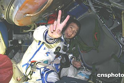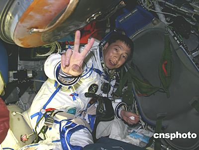 十月十六日晨六時(shí),乘坐“神舟”五號(hào)飛船在太空遨游二十一小時(shí)的中國(guó)航天員楊利偉,披著巡天萬(wàn)里的征塵,準(zhǔn)備從天外歸來(lái)。