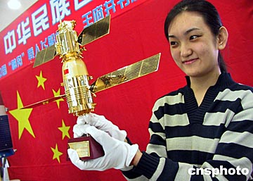 十月十六日清晨,中國(guó)首次載人航天飛行獲得圓滿(mǎn)成功,一位姑娘手捧剛剛買(mǎi)到的24K鍍金“神舟”五號(hào)載人飛船模型,激動(dòng)地在北京王府井向路人展示。中新社記者:張勤