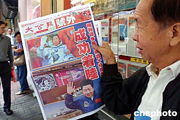 《大公報(bào)》頭版主題為“中國(guó)人起飛”,其社評(píng)稱(chēng),“神舟”五號(hào)的騰飛,也是中國(guó)改革開(kāi)放政策的重大成果。二十余年來(lái)中國(guó)航天事業(yè)發(fā)展的歷程,正是中國(guó)改革開(kāi)放過(guò)程和現(xiàn)代化建設(shè)的縮影。
