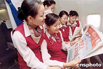 十月十六日,中國首次載人航天飛行取得圓滿成功,上海航空公司的空姐爭看有關(guān)報(bào)道,分享中國人首次上太空的喜悅。作者:夏本建