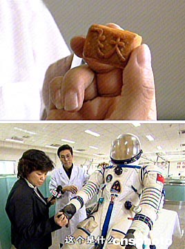 16日,北京新聞媒體記者在中國(guó)首次載人航天飛行取得圓滿成功之時(shí)參觀北京航天城,觀看中國(guó)自制的航天服和具有中國(guó)特色的航天食品——特制飛天月餅。中新社圖