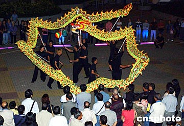 香港工聯(lián)會十六日晚在秀明小學(xué)舉行慶祝活動,祝賀中國首次載人飛船上太空成功,氣氛熱烈。圖為慶祝會上的金龍表演。作者:洪少葵
