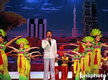 十月十六日晚,中國(guó)酒泉衛(wèi)星發(fā)射中心舉行專題晚會(huì),慶祝中國(guó)首次載人飛行圓滿成功。中心的科技人員和部隊(duì)官兵載歌載舞,歡慶“神舟”五號(hào)飛船成功發(fā)射和中國(guó)首位航天員順利返回。圖為歌舞表演《盛世中華》。中新社記者:孫自法