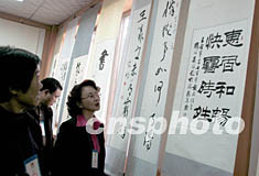 十七日,從國(guó)內(nèi)外書(shū)畫(huà)名家中的七百余幅書(shū)畫(huà)佳作,在整修后的王羲之故居舉行展覽,國(guó)內(nèi)外一千多名參加書(shū)圣文化藝術(shù)節(jié)的嘉賓興致勃勃參觀展覽。中國(guó)書(shū)法協(xié)會(huì)會(huì)長(zhǎng)沈鵬、副會(huì)張劉炳森等大名家的作品更是引人注目。中新社記者:王麗南