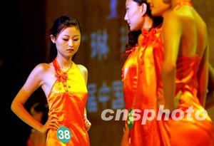 圖為選手展示具有濃郁中國傳統色彩的紅色晚裝。