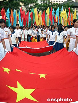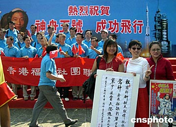 由香港民建聯(lián)等多個(gè)團(tuán)體組成的籌委會(huì),十九日上午舉行祝賀中國首次載人飛船上太空成功大巡游活動(dòng),約五千名市民參加,氣氛熱烈。作者:譚達(dá)明