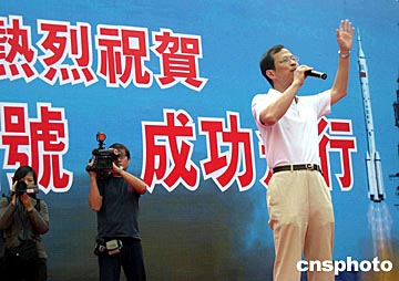香港逾五千名來自十多個(gè)團(tuán)體的市民,十九日在中環(huán)遮打花園巡游,慶祝神舟五號(hào)成功載人上太空。圖為民建聯(lián)主席曾鈺成在臺(tái)上發(fā)言。作者:譚達(dá)明