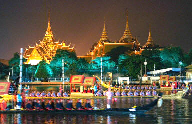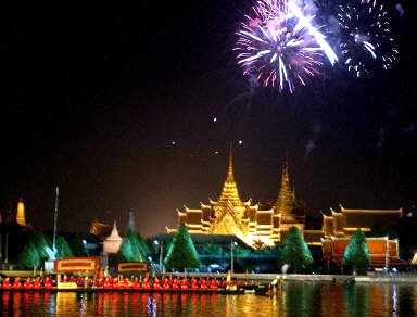 為歡迎參加apec峰會的21國領(lǐng)導(dǎo)人,泰國首都曼谷進(jìn)行煙花、游船等一系列文化展覽活動。20日晚,泰國國王普密蓬·阿杜德及王后設(shè)宴款待各國首腦,并邀請他們乘坐皇家游艇順湄南河一覽風(fēng)光。