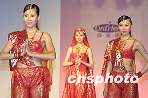 著名內(nèi)衣品牌歐迪芬,二十一日晚在上海舉行了一場(chǎng)“華夏文化內(nèi)衣秀”,推出多款具有民族風(fēng)情的新款內(nèi)衣,奪人眼球。中新社記者:湯彥俊