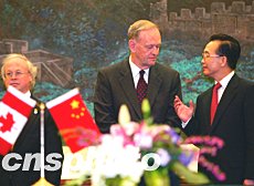 克雷蒂安贊同溫家寶對兩國關系的評價和提出的建議,他說,加中在各領域合作關系發(fā)展順利,兩國人民間的友誼不斷加深,加方對此感到滿意。加方希望雙邊貿(mào)易在今后七年內(nèi)再翻一番,期待與中方加強在能源、保險、環(huán)保、農(nóng)業(yè)等領域的合作,也歡迎更多中國人到加拿大旅游、留學。