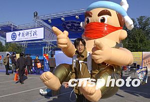 來(lái)自韓國(guó)、日本等地的互聯(lián)網(wǎng)游戲提供商與中國(guó)網(wǎng)絡(luò)游戲企業(yè)擺開陣勢(shì),“一決高下”。圖為網(wǎng)絡(luò)游戲人物向參觀者派發(fā)產(chǎn)品資料。中新社記者:張煒