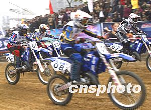 2003年“嘉陵杯”全國(guó)越野摩托車總決賽24日在重慶嘉陵賽車場(chǎng)拉開戰(zhàn)幕,來自全國(guó)21支隊(duì)伍120多名運(yùn)動(dòng)員參賽,為爭(zhēng)取全年的總排名爭(zhēng)奪異常激烈。中新社記者:趙振清