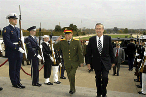 中新網(wǎng)華盛頓十月二十八日電(記者余東暉)美國國防部長拉姆斯菲爾德28日中午在五角大樓與來訪的中國國防部長曹剛川上將舉行會談,并共進工作午餐。