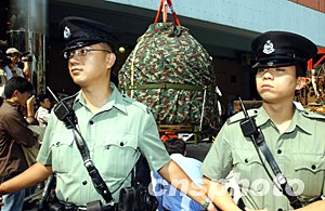 神舟五號(hào)宇宙飛船返回艙、著陸降落傘等十月三十一日運(yùn)抵香港科學(xué)館。圖為香港警察嚴(yán)加保護(hù)神舟五號(hào)展品。中新社記者:潘索菲