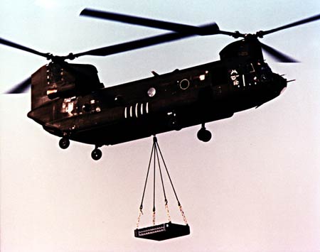在越南戰(zhàn)爭中,CH-47A主要用于為陸軍部隊運送兵員物資,特別是在為炮兵吊送火炮到不便進入的復雜地帶,為前線輸送油料(一次外吊2個各500加化容量的軟油箱)和回收近降或受傷在外的直升機(一次可吊一加UH-1)方面獲得好評。在越南南方,當以200千米/小時的速度全速低空飛行時,基本不需要別的飛機的護航。但渦輪式發(fā)動機在高山、高溫季節(jié)中出力不足,影響了性能的正常發(fā)揮。曾有3架CH-47A被改為重火力空中護航機,共裝備7.7毫米機槍7挺、20毫米機炮3門、40毫米擲彈筒一具和火箭發(fā)射巢1具,型號為ACH-47A。