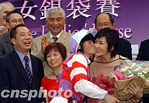 香港婦女銀袋賽十一月二日在沙田馬場(chǎng)舉行,獲得該賽頭馬的騎師親吻影星關(guān)之琳。中新社記者:潘索菲