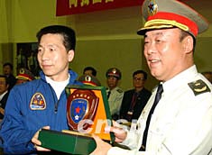 圖為在歡迎儀式上司令員王繼堂代表駐港部隊(duì)向楊利偉贈(zèng)送紀(jì)念品。