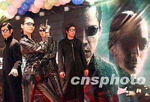 美國(guó)傳奇巨片《黑客帝國(guó):矩陣革命》十一月五日晚十點(diǎn)整,在內(nèi)地的三十余個(gè)城市的近百家影院亮相,僅在北京的十余家影院中,就有數(shù)千“駭客迷”們與全球的“駭客迷”們一起成為該片的首批觀眾。這是中國(guó)引進(jìn)大片實(shí)現(xiàn)全球同步的第一次。十一月五日晚該片北京首映式上,模特模仿片中人物形象以一身黑衣扮酷。中新社記者:張勤