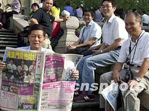 中國首飛航天員楊利偉及載人航天飛行代表團到澳門訪問,引起澳門廣大市民的極大興趣,六日上午在大三巴牌坊前,許多市民爭相閱讀有關新聞。中新社記者:李剛