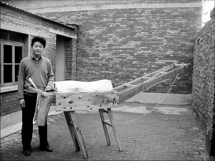 今年31歲的梁國君酷愛《三國演義》、《紅樓夢》、《孫子兵法》等古典著作,尤其對書中涉及的一些古代工藝頗感興趣。去年12月,梁國君觀看央視《科學(xué)歷程》節(jié)目,得知木牛流馬引起很多人的興趣,但苦于沒人能夠破解其原理并制造出來,讓大家一睹真容。有專家認(rèn)為木牛流馬可能就是北方的獨輪推車。木牛流馬之謎激起梁國君的好奇心。他認(rèn)真琢磨,猛然意識到木牛流馬之所以能夠運動,可能依據(jù)的是杠桿原理。他立即用硬紙片和釘子做了一只木牛的模型,用手一抬一推,模型果然向前移動,梁國君心里豁然開朗。從此以后,梁國君就利用節(jié)假日,按照《三國演義》中所說的尺寸買來木頭,自己關(guān)在房間里叮叮當(dāng)當(dāng)?shù)毓膿v起來。