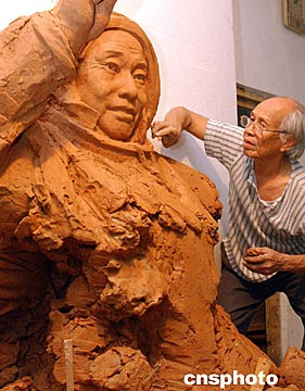 中國著名雕塑藝術家曹崇恩,近日正在為中國首次乘載人飛船登上太空的航天員楊利偉塑像,該像落成后將作為愛國主義教育作品展立在廣州曹崇恩雕塑園。圖為七十三歲的曹崇恩教授全神貫注為中國首飛太空航天員楊利偉塑像。中新社記者:錢興強