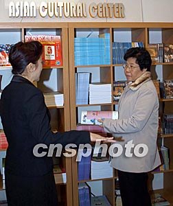 美東時間11月8日上午,中國國務(wù)院僑務(wù)辦公室主任陳玉杰(右)來到波士頓亞洲文化中心參觀,并在那里與當(dāng)?shù)厝A僑華人代表舉行僑情座談會。圖為波士頓亞文中心主任魏晶向陳玉杰介紹情況。陳建 攝