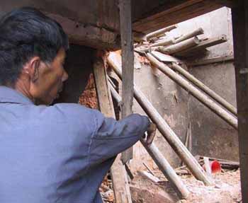 昨日上午,記者在爆炸現(xiàn)場(chǎng)看到,這個(gè)已是一片狼藉的地下鞭炮作坊原是一幢五開間的、土木結(jié)構(gòu)的廢舊民房,正廳的樓頂已被氣浪掀塌,幾根橫梁雜亂無章地堆在一起,正廳的三堵土墻已癱倒在地,其他房間的另幾堵墻也都有被震裂的縫隙,地面上隨處可見被炸開的鞭炮紙,一些村民正忙著從該房子里往外搬東西。