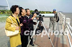 10日首次來廈門與養(yǎng)子傅宗漢相會的92歲金門老大娘翁李榮旦在兩家親人的陪同下,游覽廈門名勝古跡及新景觀廈門環(huán)島路、會展中心等地。圖為金門老大娘翁李榮旦在廈門環(huán)島路通過高倍望遠鏡觀看金門。作者:向天