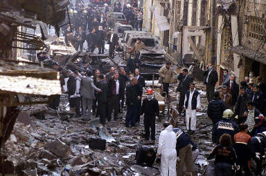 第一起爆炸發(fā)生在伊斯坦布爾最大的猶太教會堂外,另外一起爆炸發(fā)生在離這座教會堂5公里外的另外一座猶太教會堂。兩座教會堂已經嚴重受損,部分建筑已經倒塌,濃濃的黑煙從現(xiàn)場冒出,到處都是碎玻璃、扭曲變形的金屬。