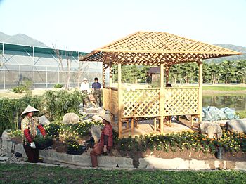 花博會期間,各種文化大餐精美絕倫,豐富多彩,將讓四海賓朋在四季如春的花博園盡情品味漳州深厚的歷史底蘊和人文風俗。圖為建設(shè)中的園藝小品。蔡文原 攝