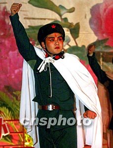 河南省安陽(yáng)市超越集團(tuán)在日前舉辦的一場(chǎng)“非公經(jīng)濟(jì)之春”文藝晚會(huì)上,上演當(dāng)年樣板戲《智取威虎山》中的共產(chǎn)黨員形象。超越集團(tuán)有健全的共產(chǎn)黨組織健全。中新社記者:宋吉河