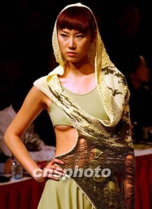十一月二十五日在北京舉行的“杉杉杯”中國(guó)時(shí)裝設(shè)計(jì)新人獎(jiǎng)評(píng)選中,多位來(lái)自大學(xué)的年青新秀展示反戰(zhàn)主題時(shí)裝,用軍綠色搭配戰(zhàn)爭(zhēng)生活的混亂。中新社記者:賈國(guó)榮