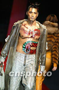 喜得龍.計(jì)文波時裝發(fā)布會二十五日晚在中國國際時裝周上舉行,一名男模特身繪火龍出場,寓意中國時裝品牌發(fā)展的龍馬精神。中新社記者:毛建軍