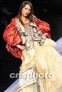 十一月二十五日晚,紫禁城的四季·馬克張春夏高級時裝發(fā)布會在北京中國大飯店舉行,著名時裝設(shè)計師張肇達通過對東方精神的探索、對中華文明的理解和把握,用服裝語言詮釋了紫禁城的獨特氣質(zhì)。圖為模特展示一款雍容華貴的時裝。中新社記者:盛佳鵬