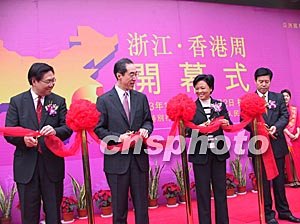 由浙江省人民政府和香港特區(qū)政府主辦的浙江香港周活動二十七日開幕。圖為浙江省委副書記喬傳秀、副省長鐘山、香港特區(qū)政府財政司司長唐英年出席開幕式。作者:張茵