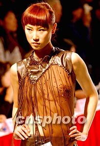 一名模特身著中國大學(xué)生設(shè)計的咖啡色透視裝,展示迷人風(fēng)采,參加十一月北京舉行的“杉杉杯”中國時裝設(shè)計新人獎評選。中新社記者:賈國榮