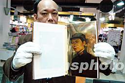 這部《毛澤東詩詞手跡》精選了《沁園春·雪》等17幅詩詞手跡,4幅反映毛澤東同志不同時期的珍貴照片,全書采用納米技術(shù)以純度達99.%的黃金紙精心印制而成。金書的封面鑲嵌著上海造幣廠制造的純金毛澤東頭像章,書的封盒為紫檀木手工雕成,江澤民同志為該書題寫了書名。劉蔚丹 攝