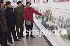 中國名人書畫院副院長、當(dāng)代山水畫家衣惠春(右一),十二月十六日在福州舉辦的衣惠春山水畫展上首度將其長四十二米的新作《武夷山神韻圖卷》展示給福建觀眾。此卷由衣惠春歷時(shí)近四個(gè)月創(chuàng)作完成,以“雙世遺”武夷山代表性景觀為主線,通過中國畫形式表現(xiàn)武夷山九曲十八彎的意境。作者:劉可耕