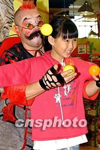 來自俄羅斯的莫斯科馬戲團十二月十六日在香港舉行演出發(fā)布會,該團將在香港連續(xù)進行為期數(shù)月的演出活動,全新的馬戲節(jié)目為香港觀眾帶來歡樂、刺激的新感受。圖為馬戲團小丑指導小朋友練雜耍。中新社記者:錢興強