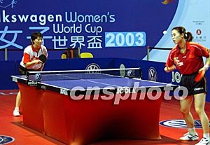 二零零三年女子世界杯乒乓球賽十二月十八日繼續(xù)在香港伊利莎伯體育館進(jìn)行,圖為中國選手王楠對加拿大選手徐光宏。中新社記者:錢興強(qiáng)