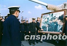 毛澤東于1953年2月19日首次視察解放軍海軍部隊,在武漢登上“洛陽”艦和該艦官兵一起航行,并揮毫題詞:“為了反對帝國主義的侵略,我們一定要建立強大的海軍”!奥尻枴迸灩俦12月20日在毛主席與“洛陽”艦官兵交談的巨幅照片前重溫領(lǐng)袖題詞,紀(jì)念毛澤東誕辰110周年。作者:毛昭勝
